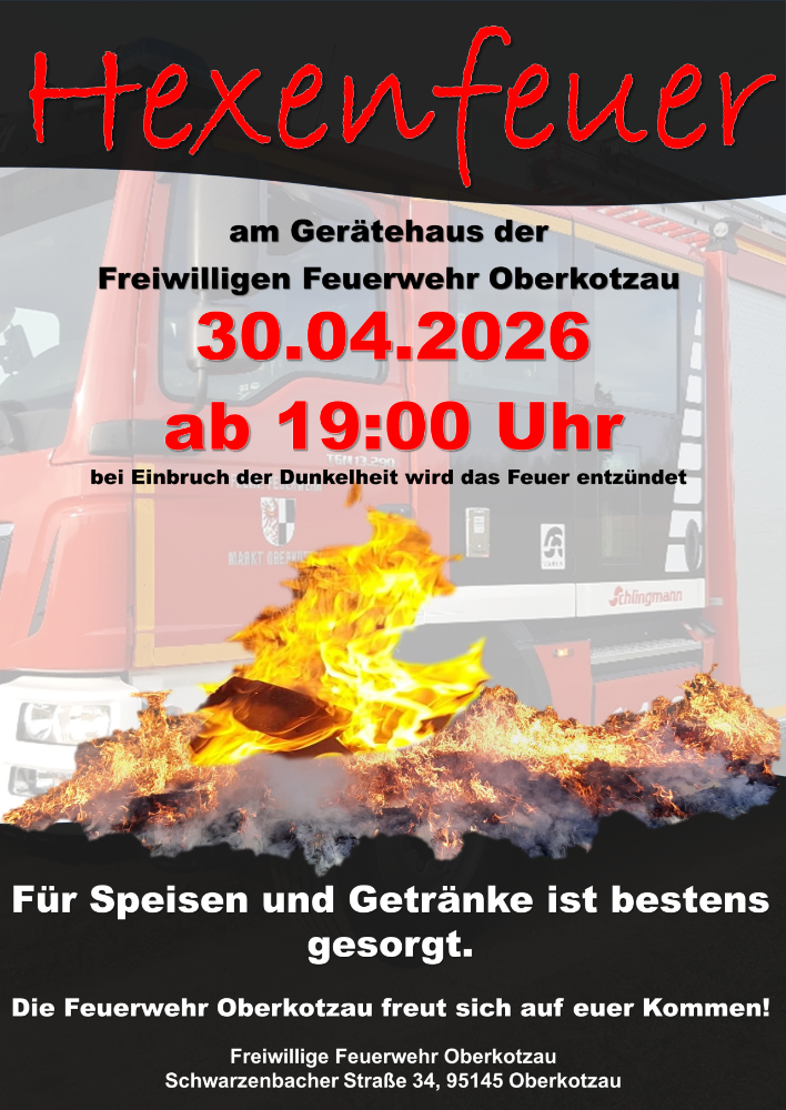 Die Feuerwehr Oberkotzau lädt am 30.04.2026 ab 19:00 Uhr wieder zu ihrem Hexenfeuer an das Gerätehaus Oberkotzau ein.