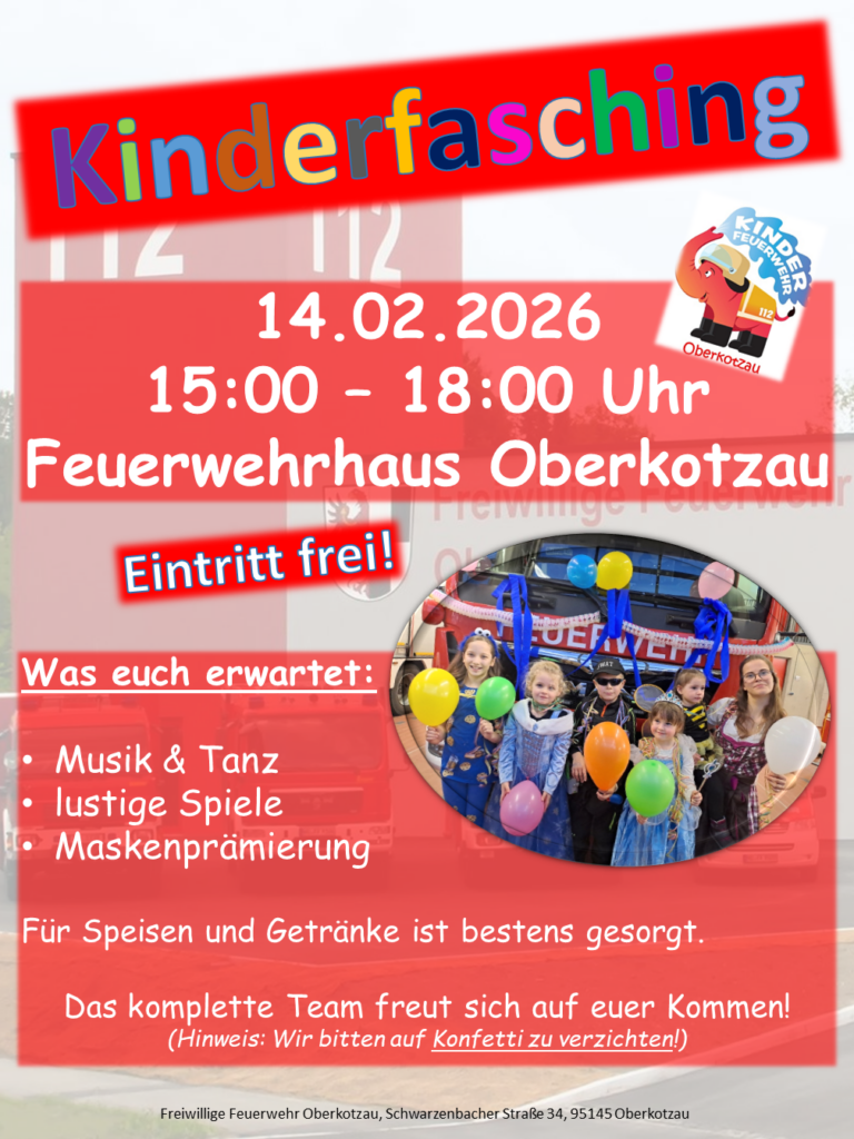 Die (Kinder-)Feuerwehr Oberkotzau veranstaltet dieses Jahr wieder einen Kinderfasching im Gerätehaus in der Schwarzenbacher Straße 34.