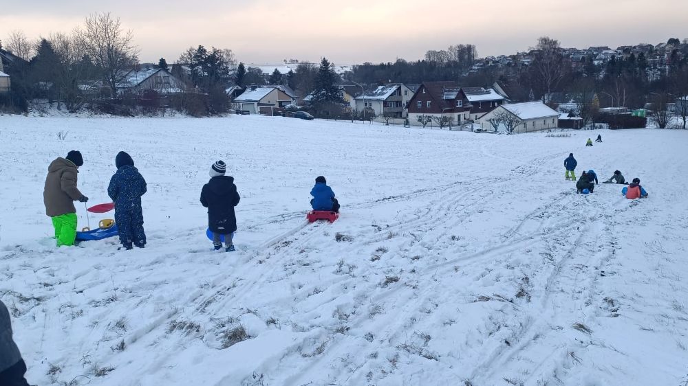 Dick eingepackt trafen wir uns am Gerätehaus und liefen mit unseren Schlitten zu einem nahen Hügel. Die ersten Rodelversuche waren noch ein bisschen mühsam, weil wir die ersten waren, die dort Schlitten fuhren. Aber noch kurzer Zeit waren die Bahnen eingefahren. Manche Kinder machten außerdem Schneeengel, andere forderten sich zu Schneeballschlachten heraus.