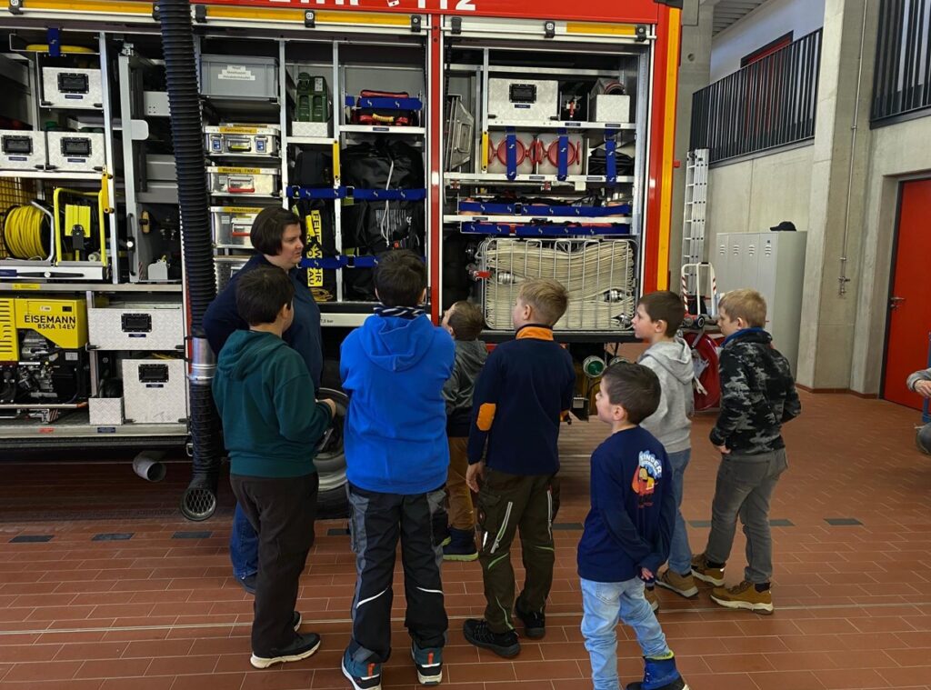 Bei unserem Treffen im Februar überlegten wir uns zunächst gemeinsam, zu welchen Einsätzen die Feuerwehr gerufen werden könnte. Danach schauten sich die Kinder die Geräteräume der Fahrzeuge an und besprachen, was für welchen Einsatz gebraucht wird. So stand schnell fest, dass man zum Beispiel einen Mülleimerbrand mit einem Feuerlöscher oder der Kübelspritze löschen könnte oder wenn ein Baum quer über der Straße liegt die Motorsäge mit kompletter Schutzausrüstung zum Einsatz kommt. Nachdem alle „Einsätze“ abgearbeitet waren, spielten wir zum Abschluss noch ein paar Feuerwehrspiele.