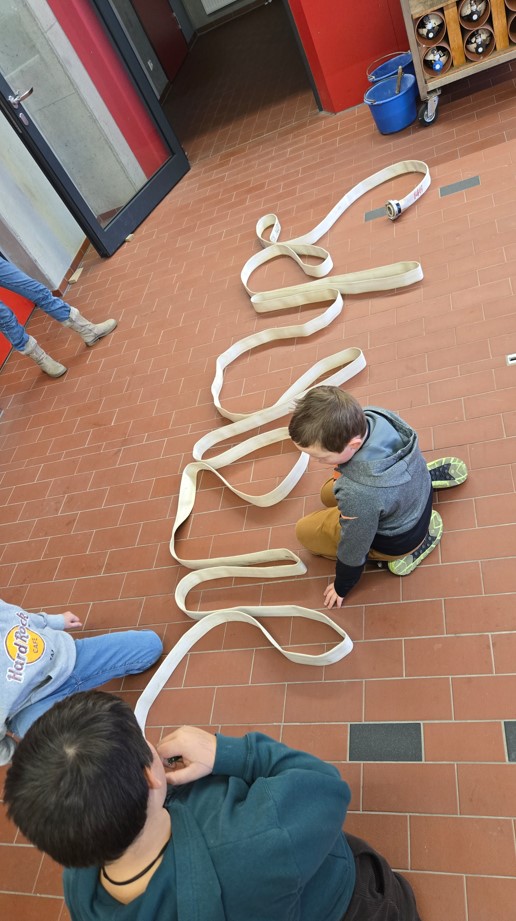So wurde zunächst besprochen, wie viele Leute zu einer Gruppe gehören und wer welche Aufgabe hat. Danach wurde mit Hilfe eines Filmes herausgefunden, welches Material benötigt wird und wie der Aufbau des Löschangriffes ist. Nach dieser Theorieeinheit gings in die Praxis, allerdings mit kindgerechtem Material. Jeder hatte die Möglichkeit jede Position innerhalb der Löschgruppe auszuprobieren. Am Ende musste nicht nur aufgeräumt, sondern auch die Schläuche gereinigt werden.