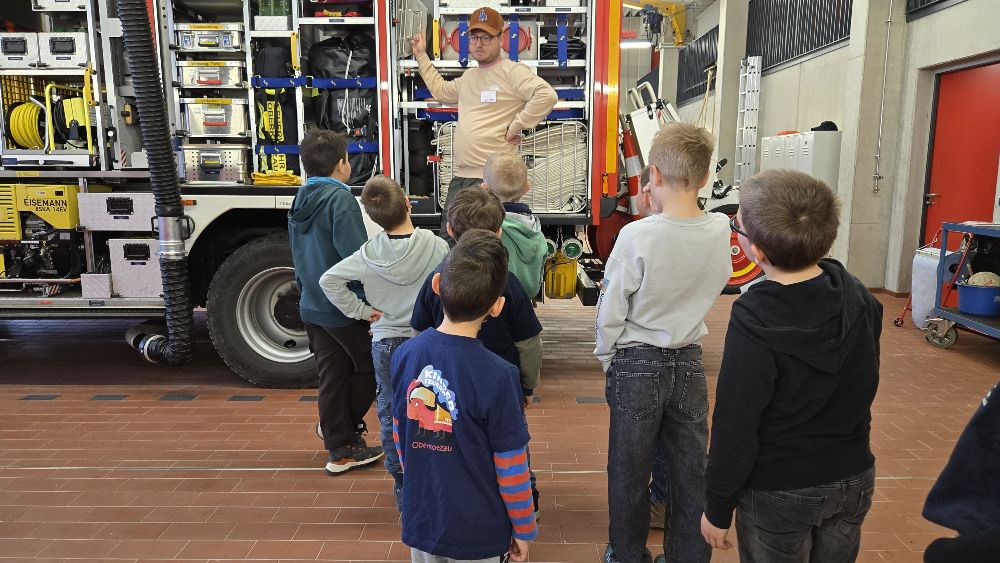 Der Februardienst der Kinderfeuerwehr begann damit, mit den Kindern durchzugehen, welche Aufgaben die Feuerwehr hat. So wurden unter anderem Brandschutz, Bergung, Brandschutzerziehung, Ausrüstung, Katastrophenschutz und auch die Fahrzeugtechnik angesprochen.
